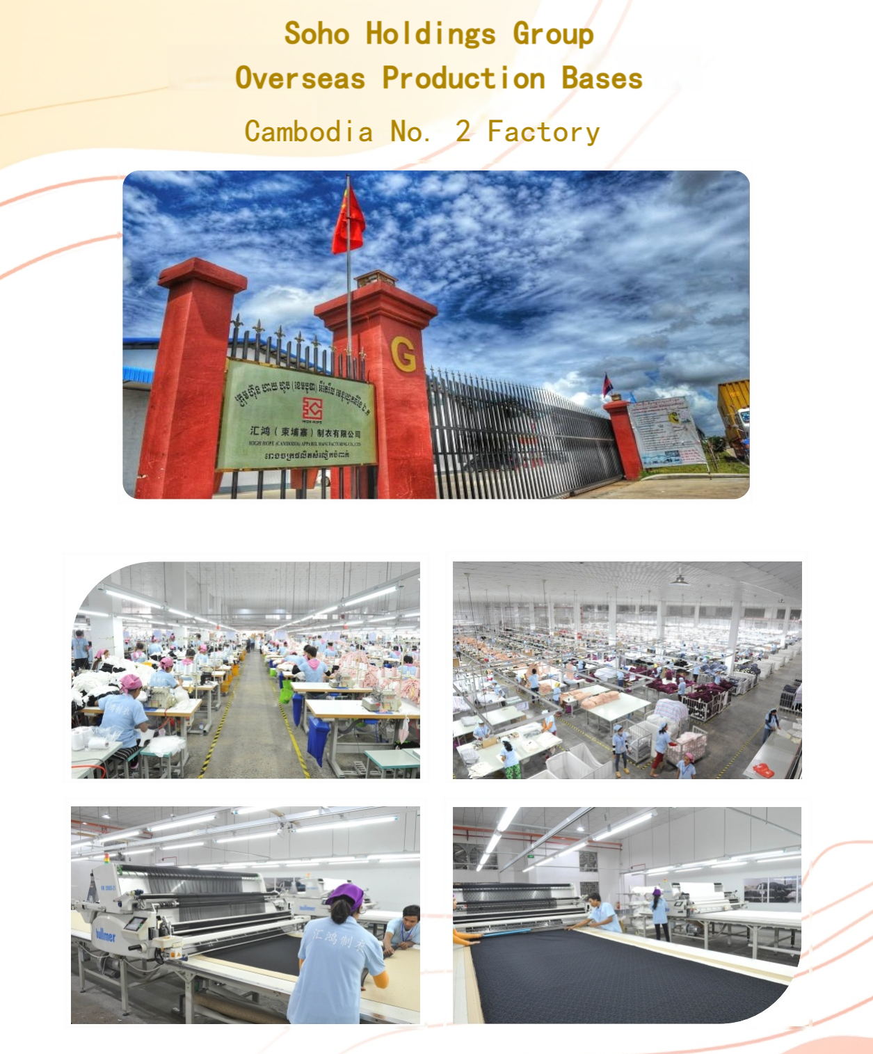 SAINTY's production capacity is based on the dual support of domestic manufacturing and overseas channels, with seven domestic factories and one Bangladesh office. In addition, SOHO Holdings Group, the parent company of SAINTY, owns six overseas textile and garment factories, which also provides a solid guarantee for overseas production of SAINTY. These factories produce wide ranges of clothing types such as coats, jackets, suits, dresses, skirts, pants, casual wear and other types, which are sold to mainstream trading markets in Europe, the United States, Asia-Pacific, Oceania and so on.
